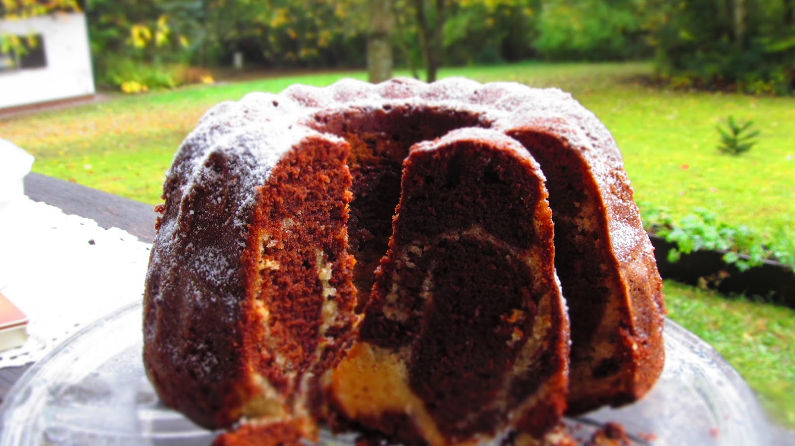 Сервирам добре изстиналия кекс поръсен с пудра захар.