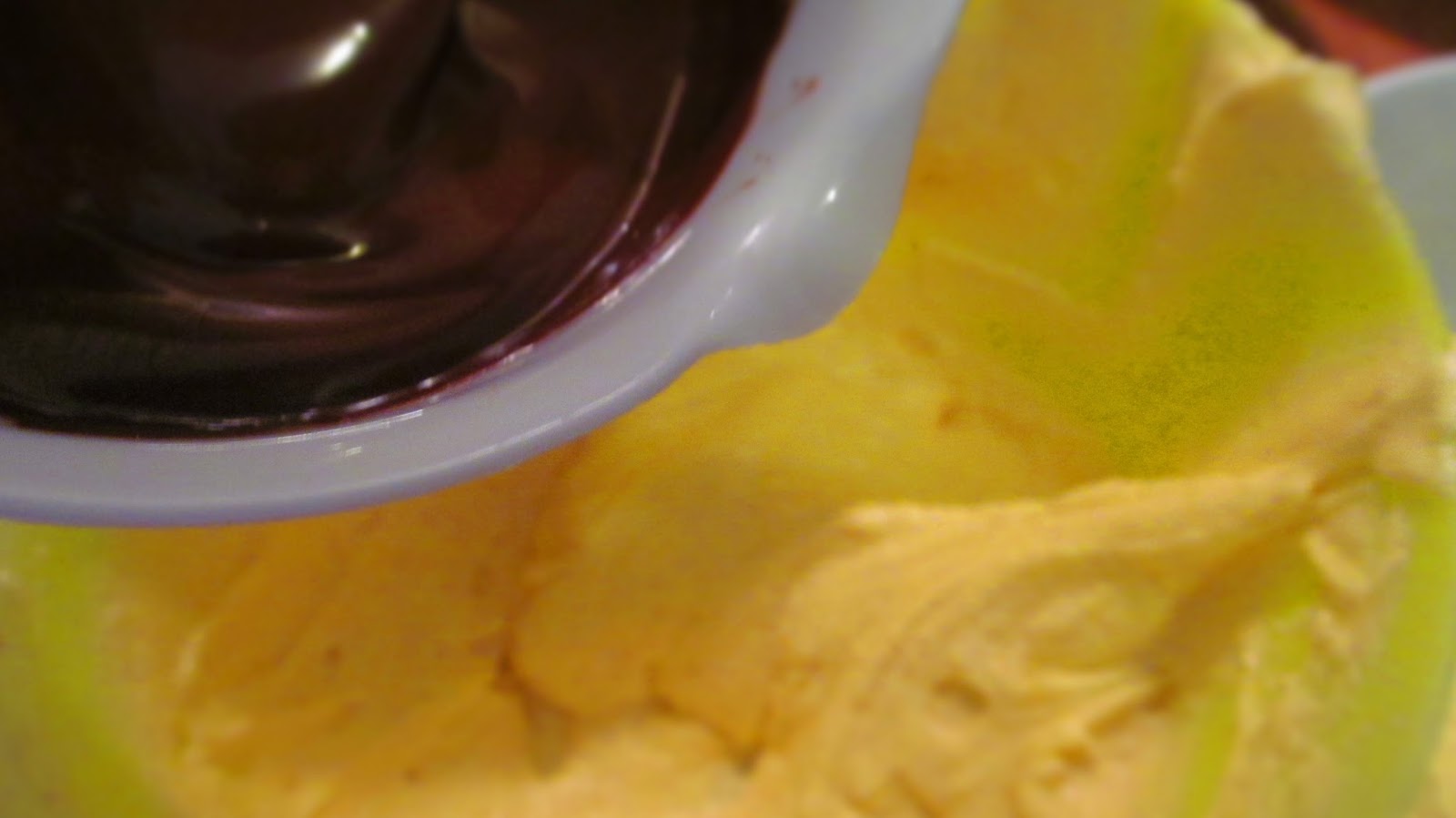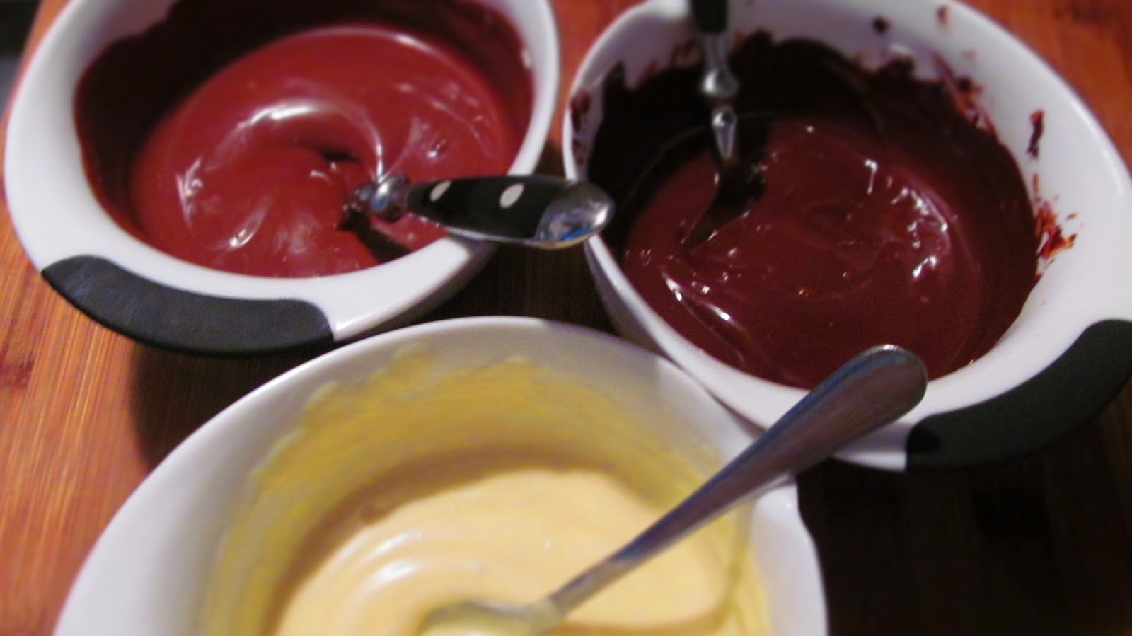 - Към всяка купа добавих различен на цвят шоколад и разбърках добре.