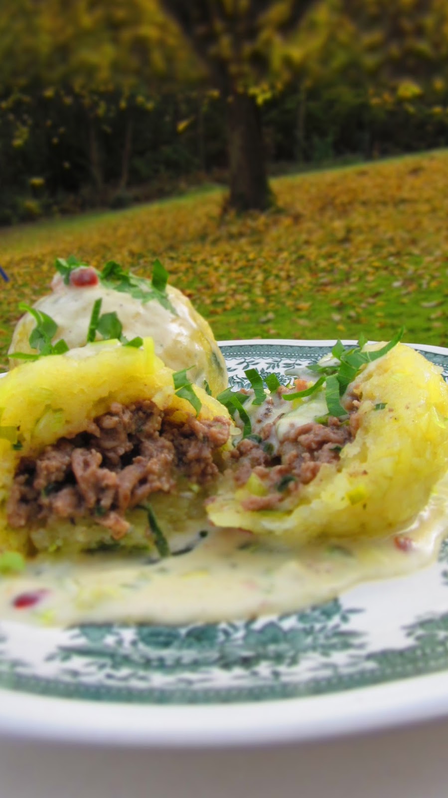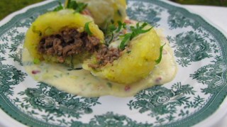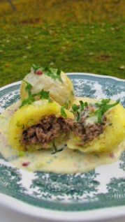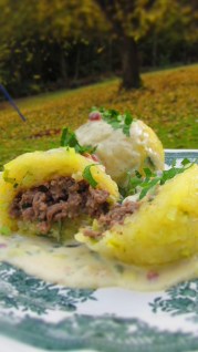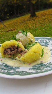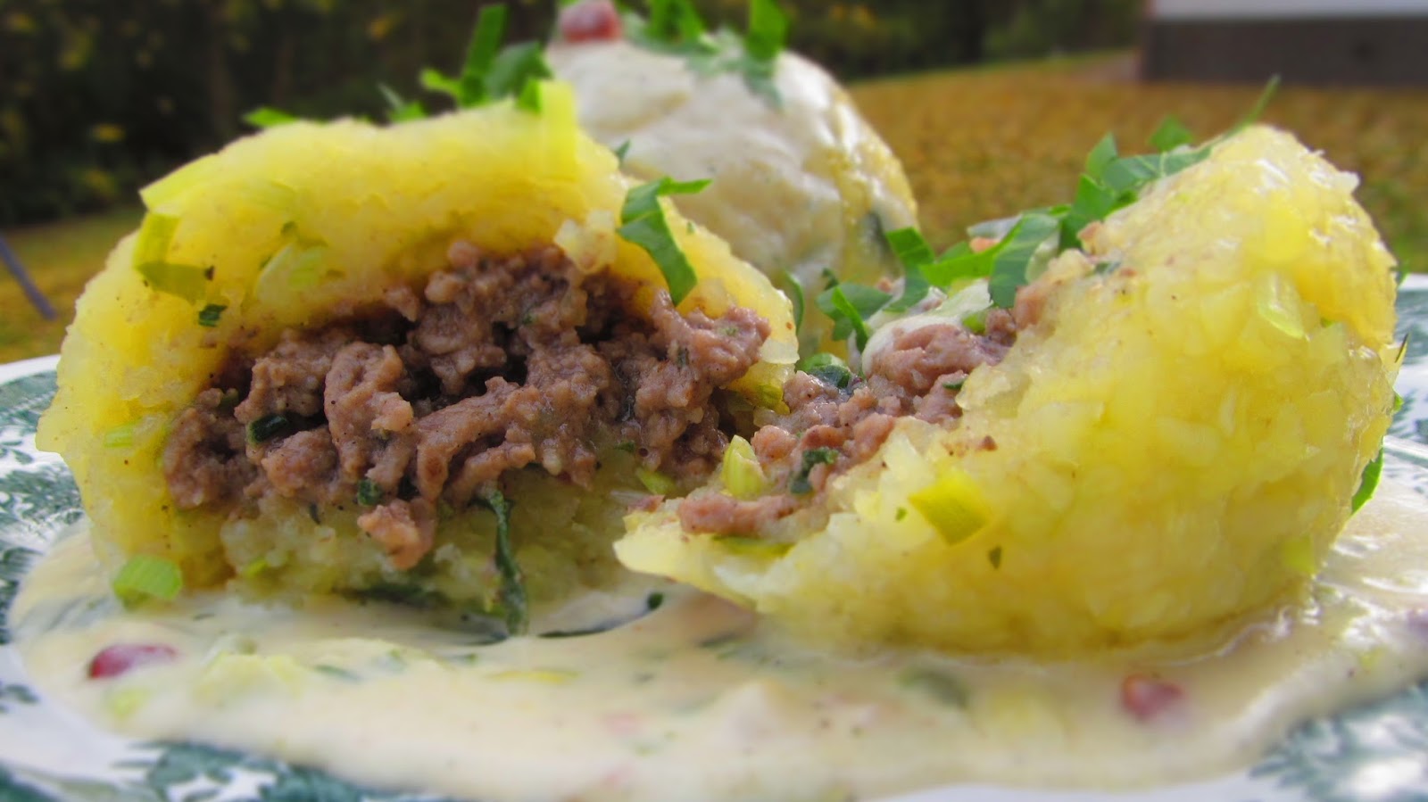 Както знаете вече, в последните седем години аз и моят съпруг живеем в Германия. Живеем в една красива част на тази голяма държава, а именно в Хунсрюк. Още първата година опитах типичните за този район пълнени картофени топки и останах очарована. Вече седем години, когато дойде есен се отяждам на този местен деликатес. Вече е деликатес, защото много малко хора се наемат да приготвят ястието у дома. На местен диалект се наричат Gefüllte Grumbiereklees.
