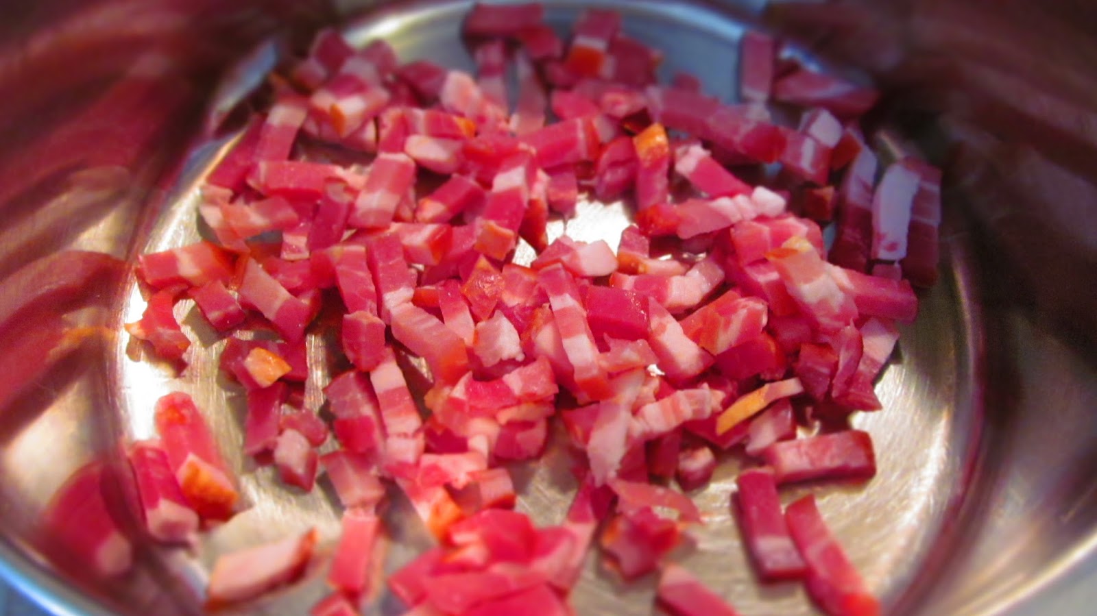 - През това време си приготвям соса. За целта в тенджера и без мазнина изпържвам бекона, докато леко се зачерви.