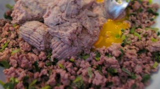 - Към охладената кайма добавям пастета, яйцето и подправям със сол, черен пипер и риган. Омесвам като за кюфтета.