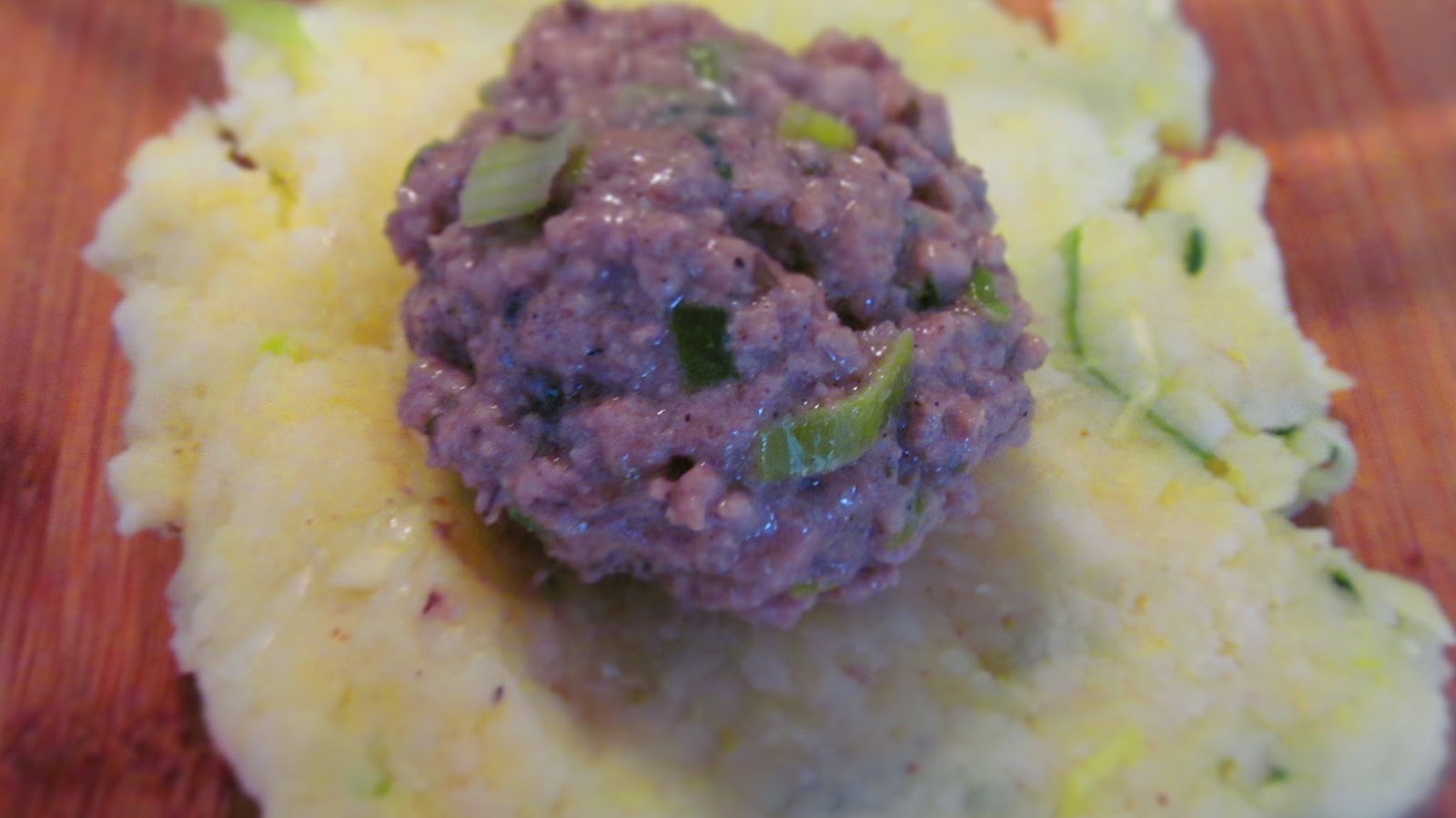 - Всяко топче от кайма увивам в картофено тесто. Притискам внимателно с пръсти, за да стане топката стегната.