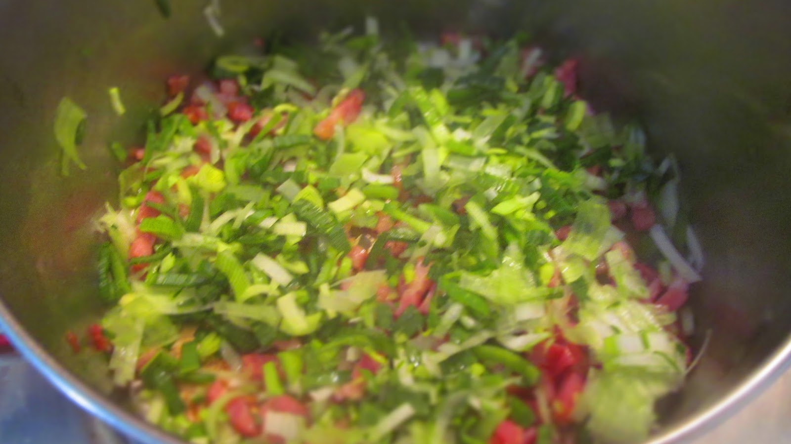 - Започвам с нарязването на много ситно на стръка праз лук. Един праз лук използвам в картофеното тесто, в плънката и в соса.