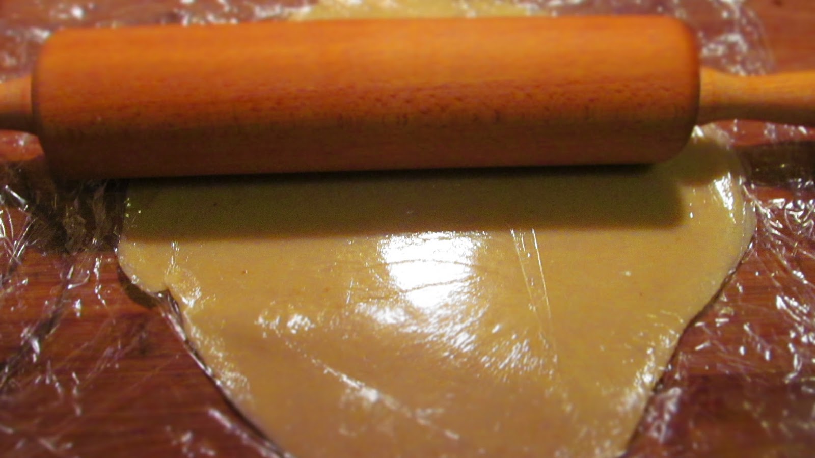 - Марципана омесвам с 40 гр пудра захар и разточвам на кора между две парчета прозрачно фолио.