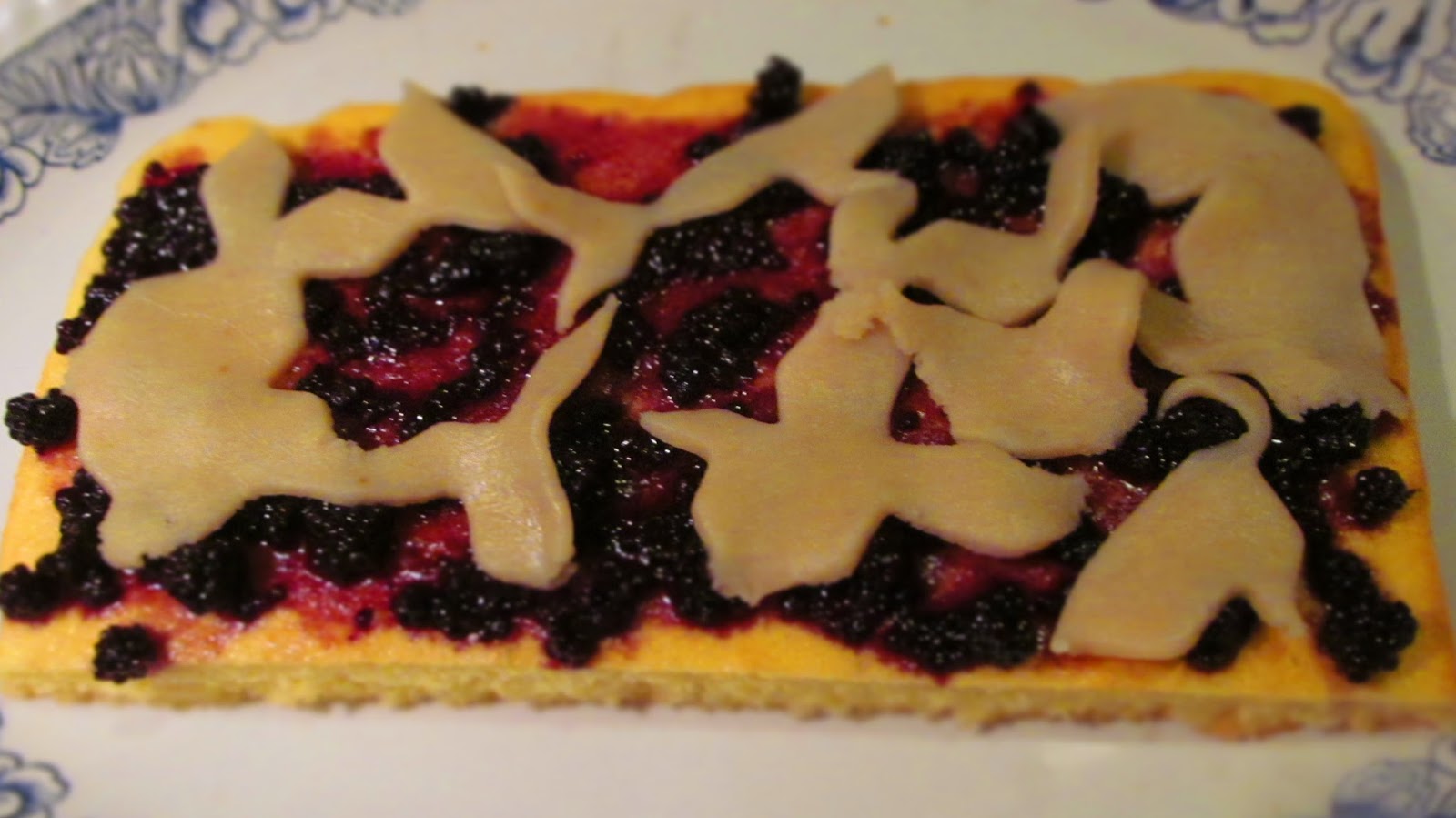 - Подреждането на тортата започвам от най-широката лента блат. Намазвам с конфитюр и подреждм част от останалия от изрязването на звездичките марципан.