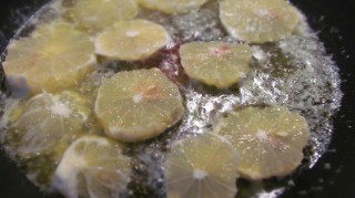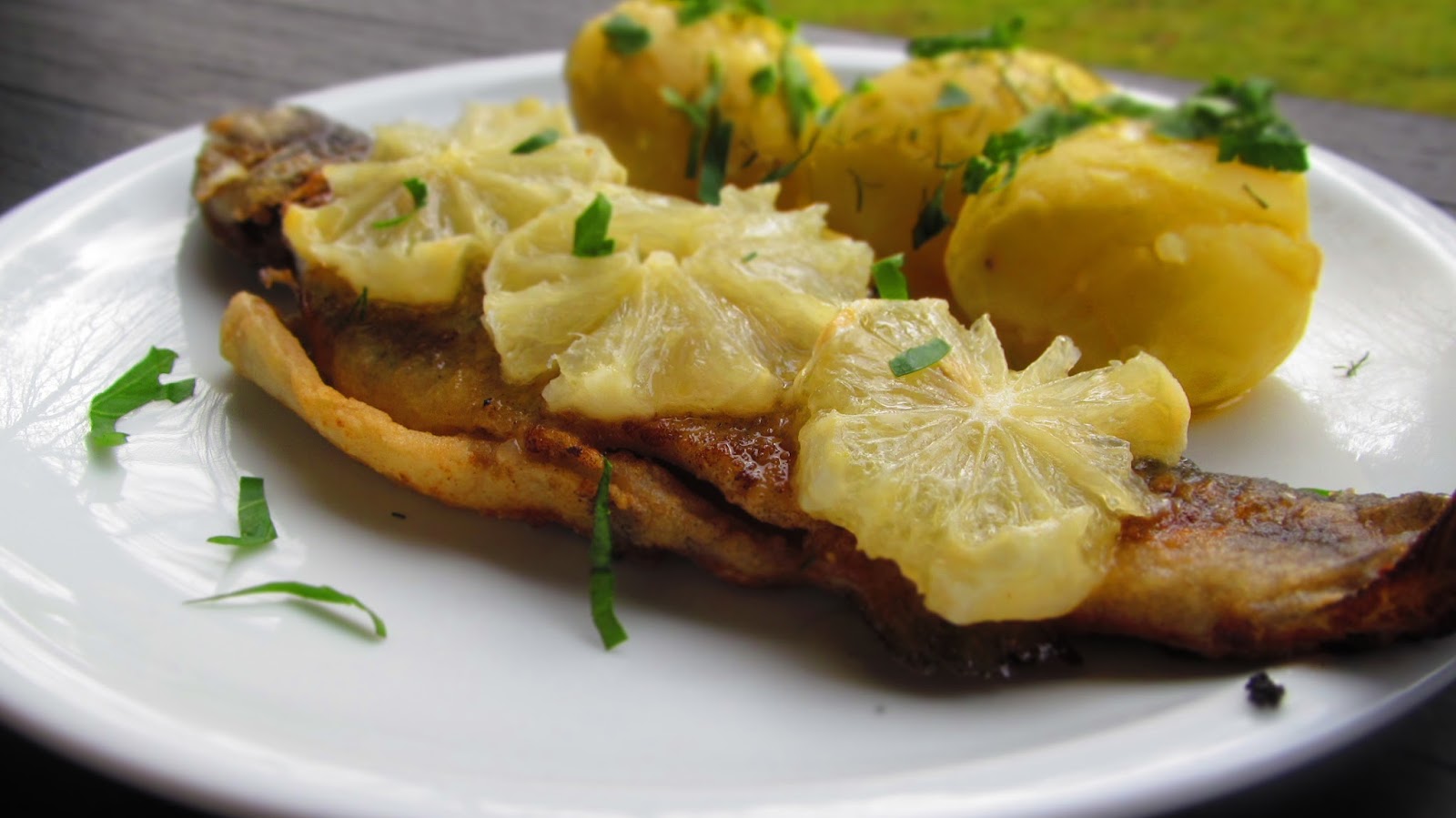 - В друг тиган разтопявам маслото и изпържвам предварително обеления и нарязан на филийки лимон. По този начин получавам вкусното масло с лимонов аромат и поливам рибата и картофите.