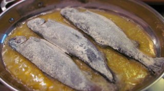 - Пъстървата подреждам в горещата мазнина и изпържвам от едната страна, докато видя златисти краища. Тогава обръщам. Важното е рибата да получи златист загар и хрупкава коричка.