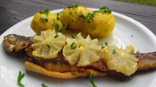 Сервирам по една гореща риба на човек и поръсвам със ситно нарязан магданоз, а изпържените лимонови филийки подреждам върху рибките. С ароматното лимоново масло заливам хрупкавата пъстърва и варените картофи.
