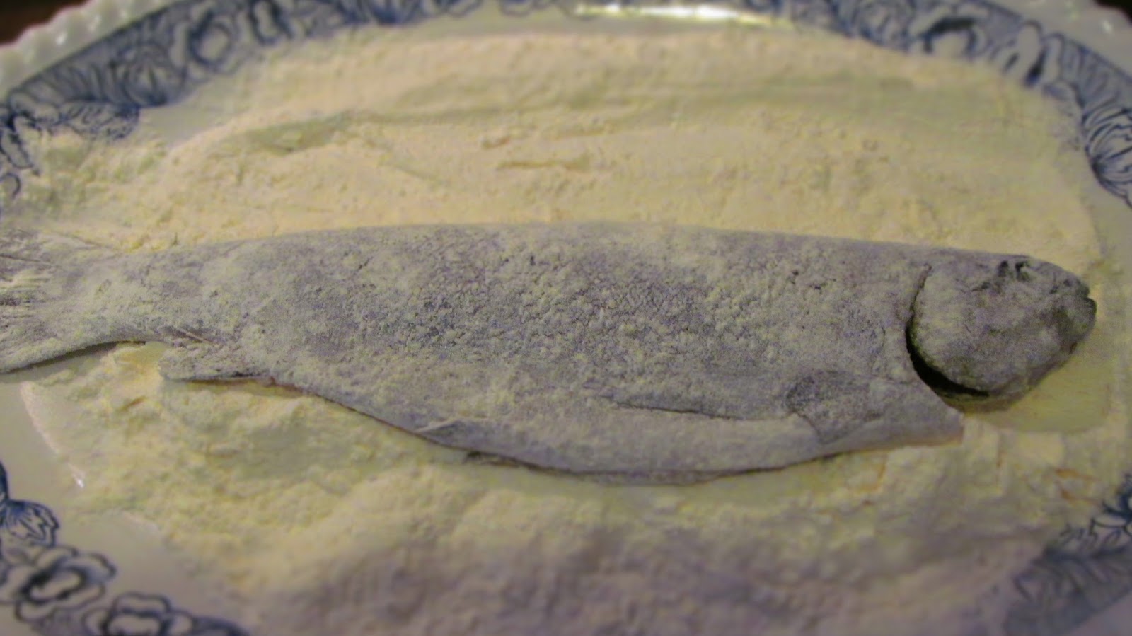 - Почистената, измита и подсушена риба овкусявам със сол и черен пипер. Овалвам обилно в брашно, а излишното количество просто изтупвам.