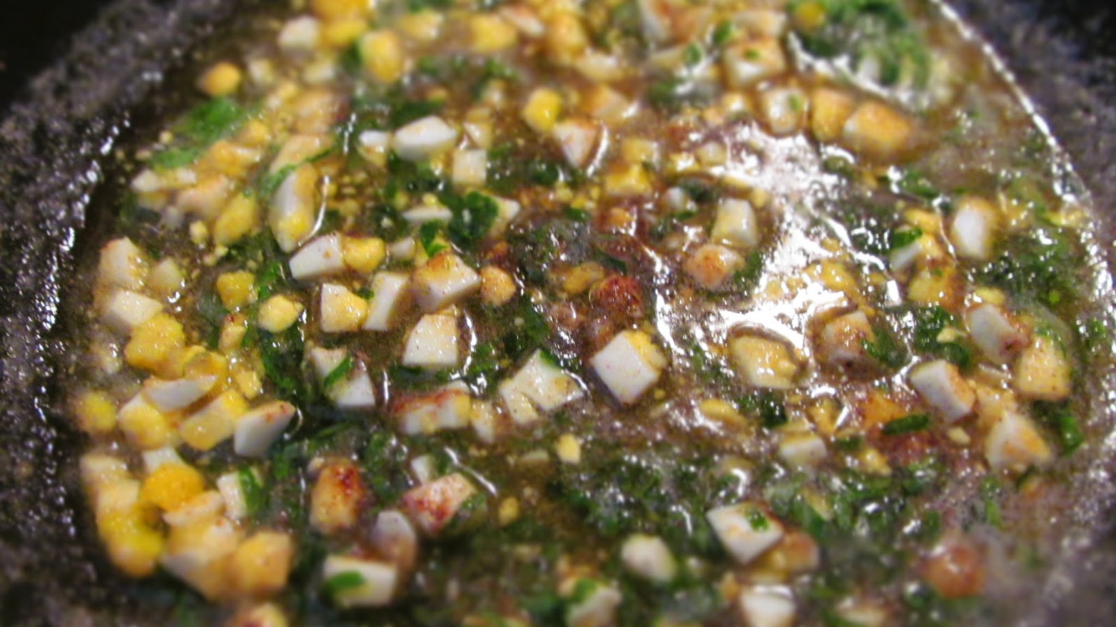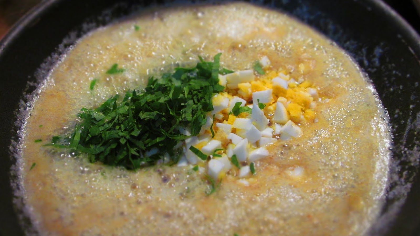 - Изсипвам ситно нарязаните варени яйца и магданоза. Разбърквам.