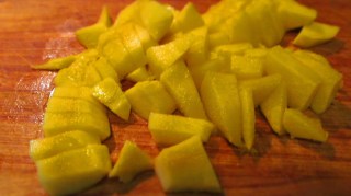 - Мангото обелвам, внимателно отделям от костилката и нарязвам на кубчета.
