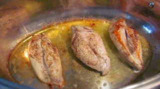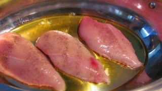 - Загрявам мазнината в достатъчно голяма тенджера /тиган/ и изпържвам до златисто пилешките гърди от всички страни.