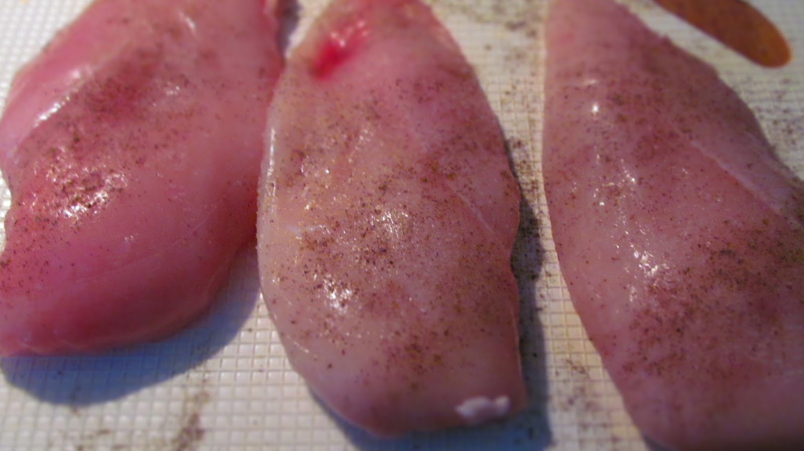 - Пилешките гърди измивам, подсушавам и овкусявам със сол и черен пипер.