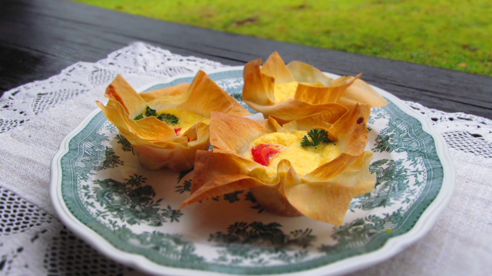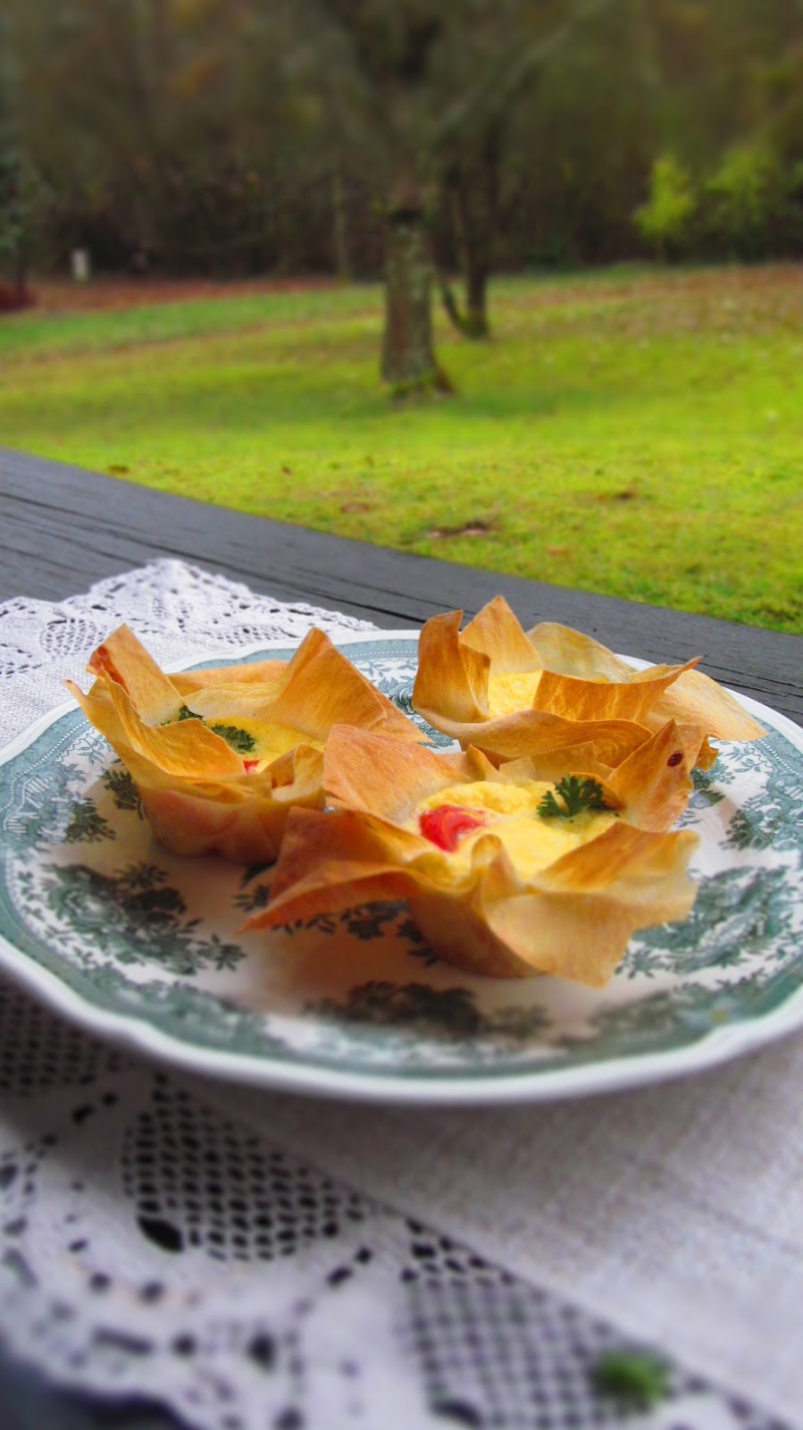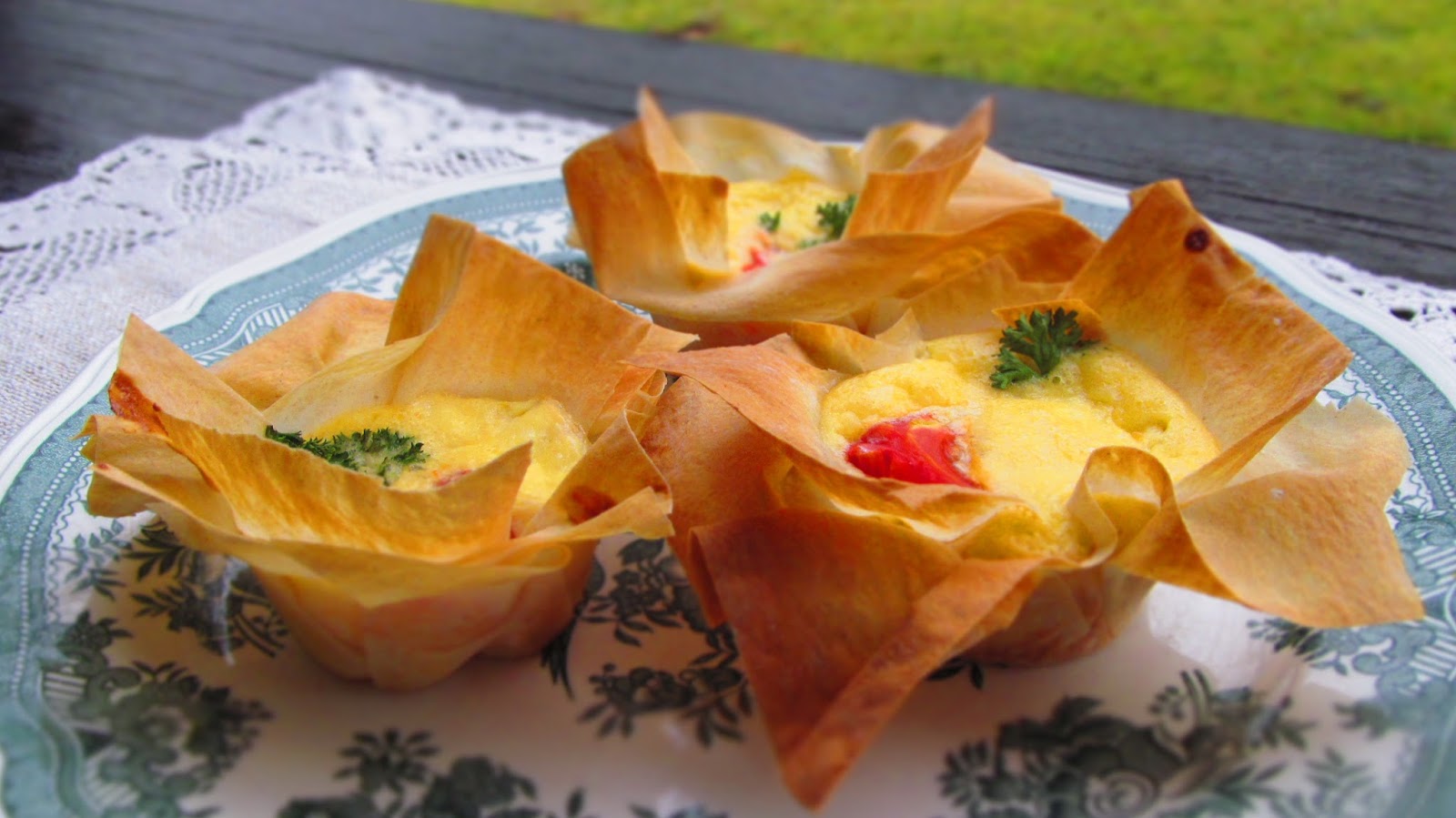 Днес Ви показвам една вкусна идея от фини кори за баница, напълнени и изпечени във формата за мъфини. Когато краищата на корите се оставят да стърчат, стават хрупкави след изпичането и приличат на кошнички.