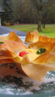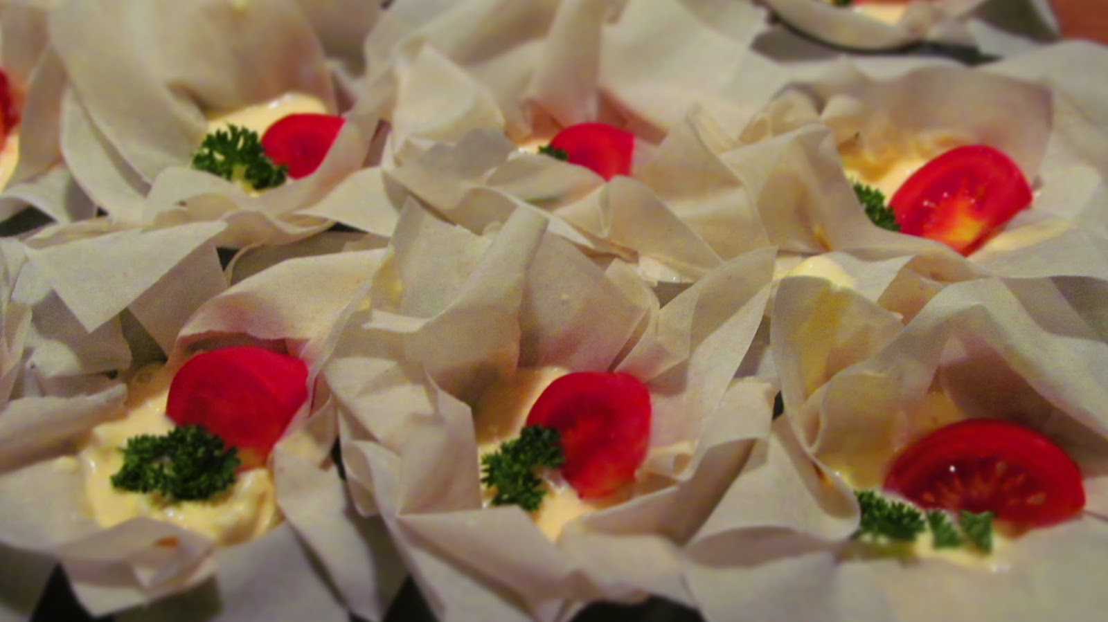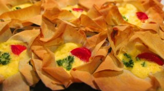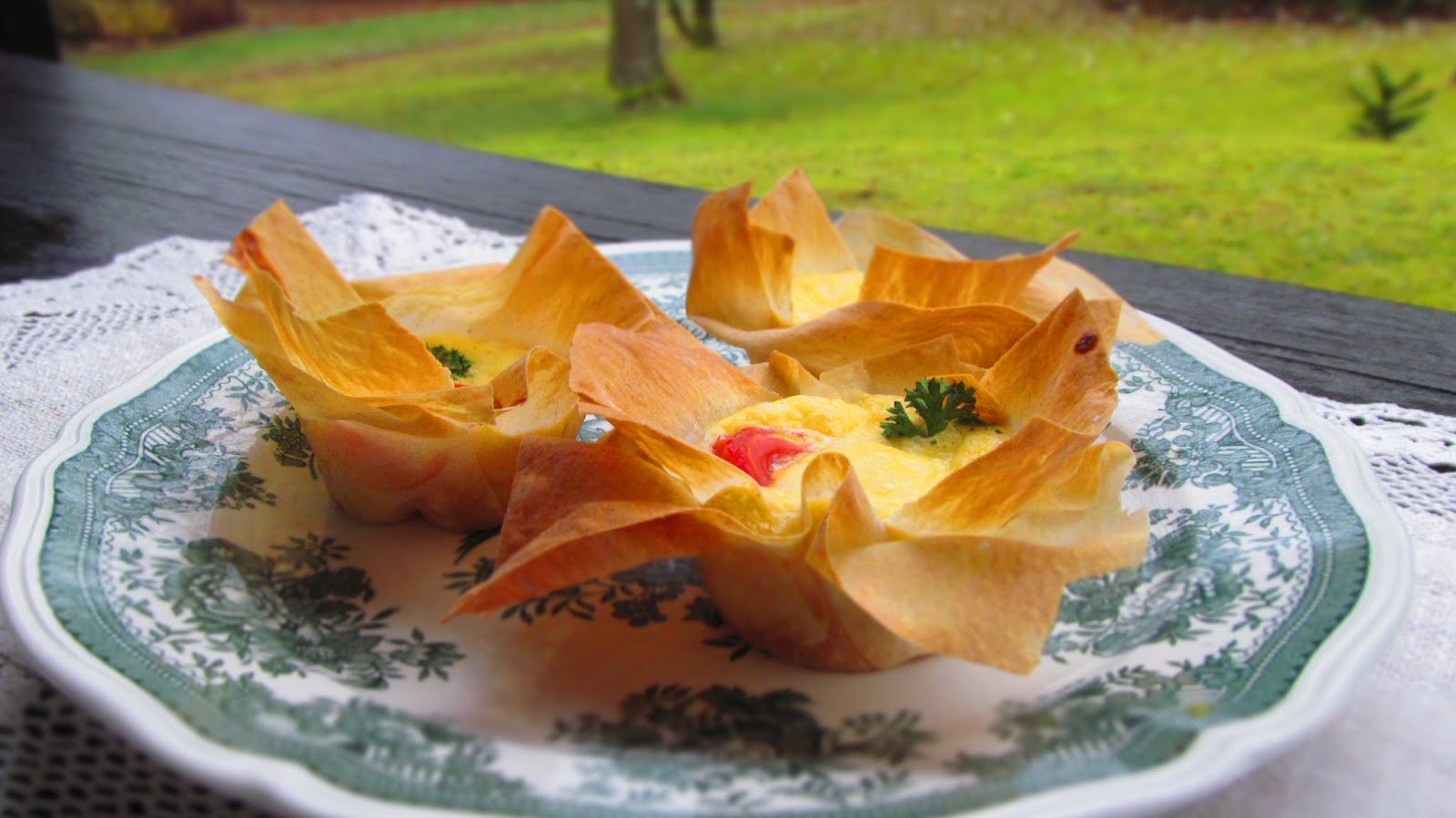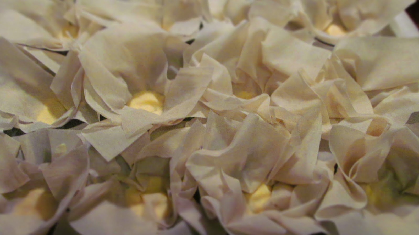 Днес Ви показвам една вкусна идея от фини кори за баница, напълнени и изпечени във формата за мъфини. Когато краищата на корите се оставят да стърчат, стават хрупкави след изпичането и приличат на кошнички.