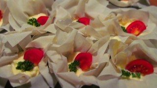 - Отгоре забождам по един резен домат /или цяло чери доматче/ и цветче от магданоз.