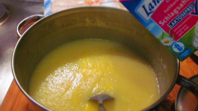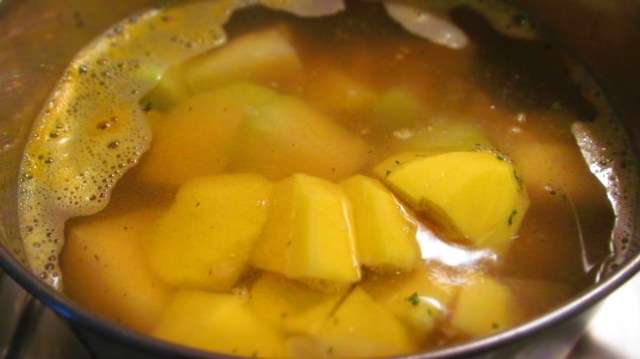 - Заедно с обеления и нарязан на едро картоф /той е за уплътняване на супата/ добавям към сварения зеленчуков бульон и варя поне 20 минути или до пълното омекване на зеленчуците.
