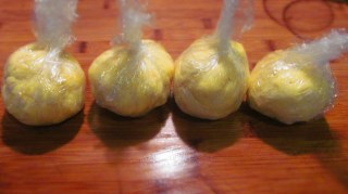 - Тестото разделям на четири топки, които увивам в стреч фолио и оставям за 1 час на студено в хладилника.