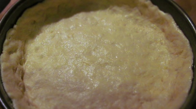 • С втасалото тесто покрих дъното и стените на формата. Покрих с кърпа и оставих за около 20 минути отново да втаса.