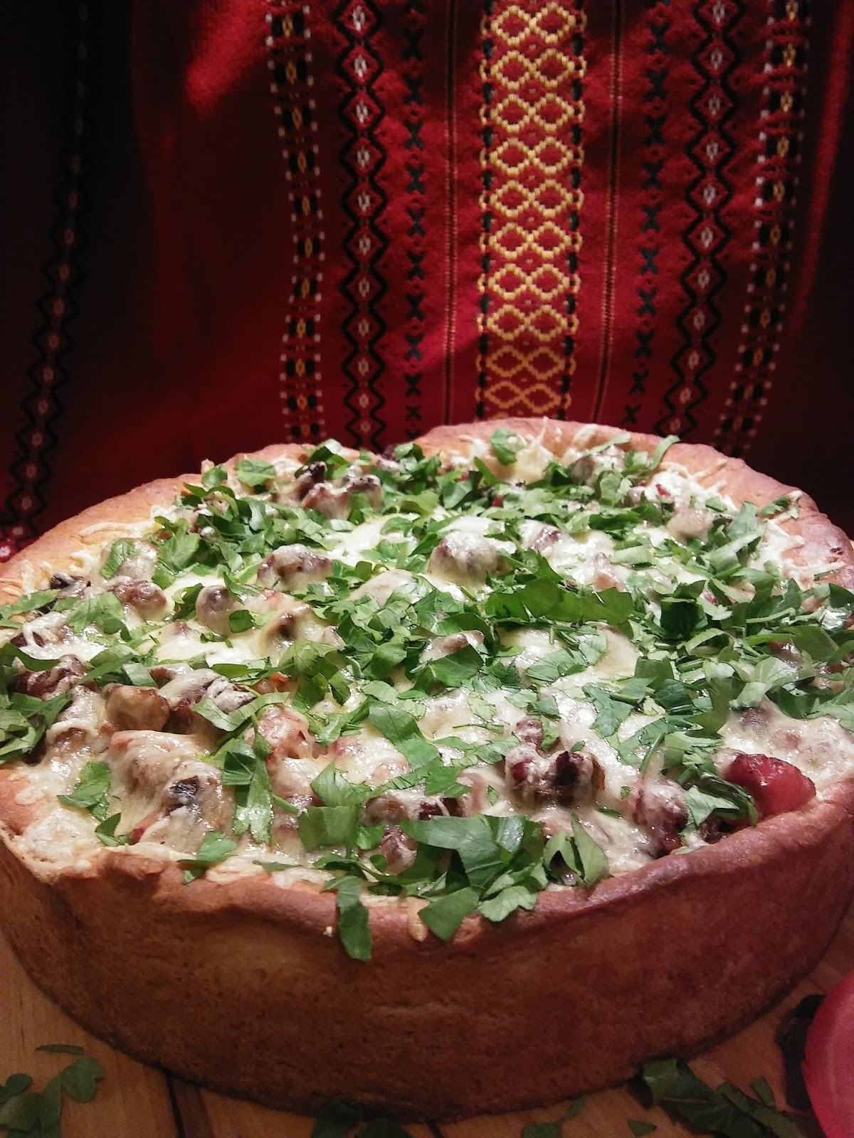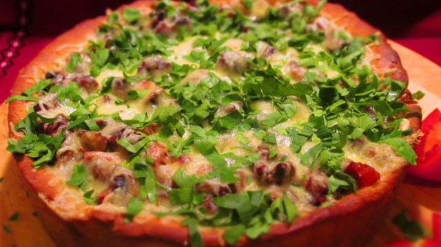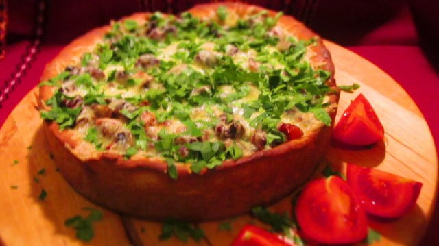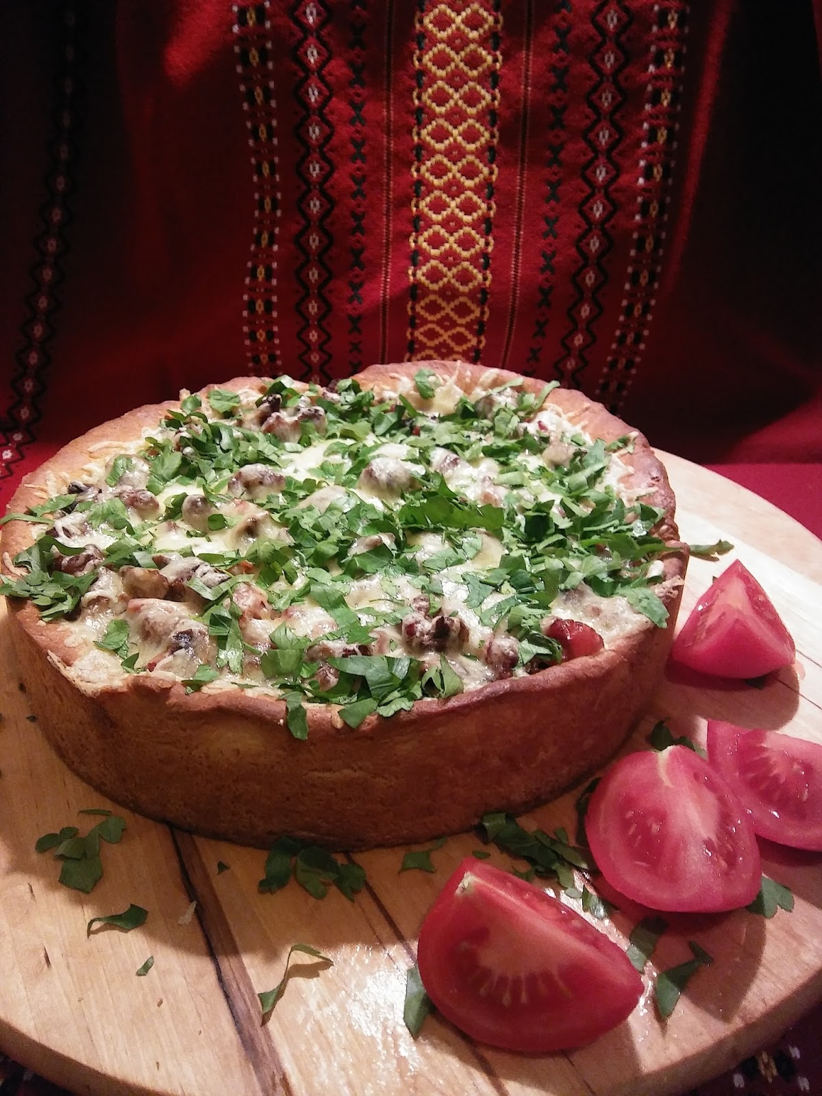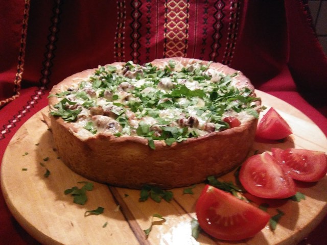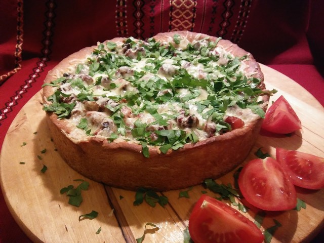 • Готовия калпак оставих леко да изстине, отделих стените на формата и внимателно преместих върху дъската за сервиране. Поръсих обилно с пресен магданоз. Нарязах като торта.