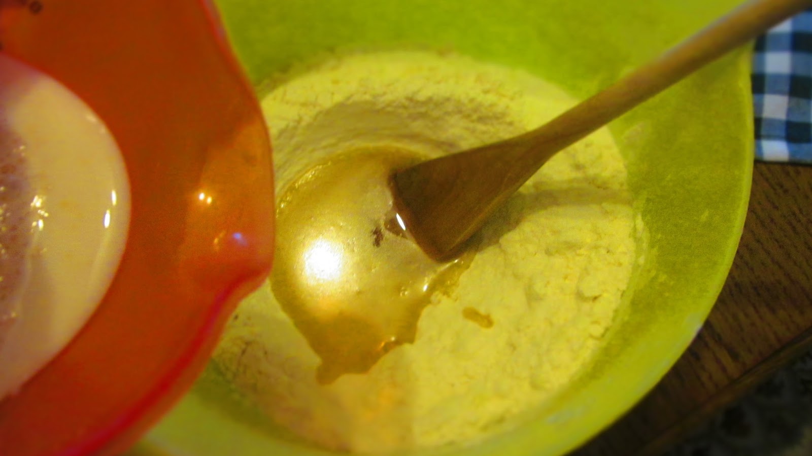• В купа смесих брашното със солта. Направих кладенче, сипах олиото и добавих млякото с маята.