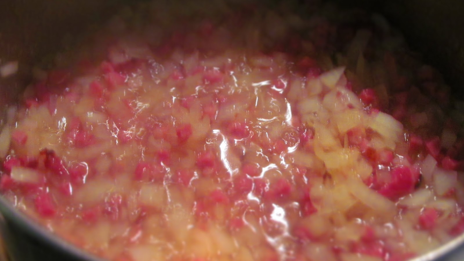 • В същата мазнина изпържих ситно нарязания бекон и добавих лука.