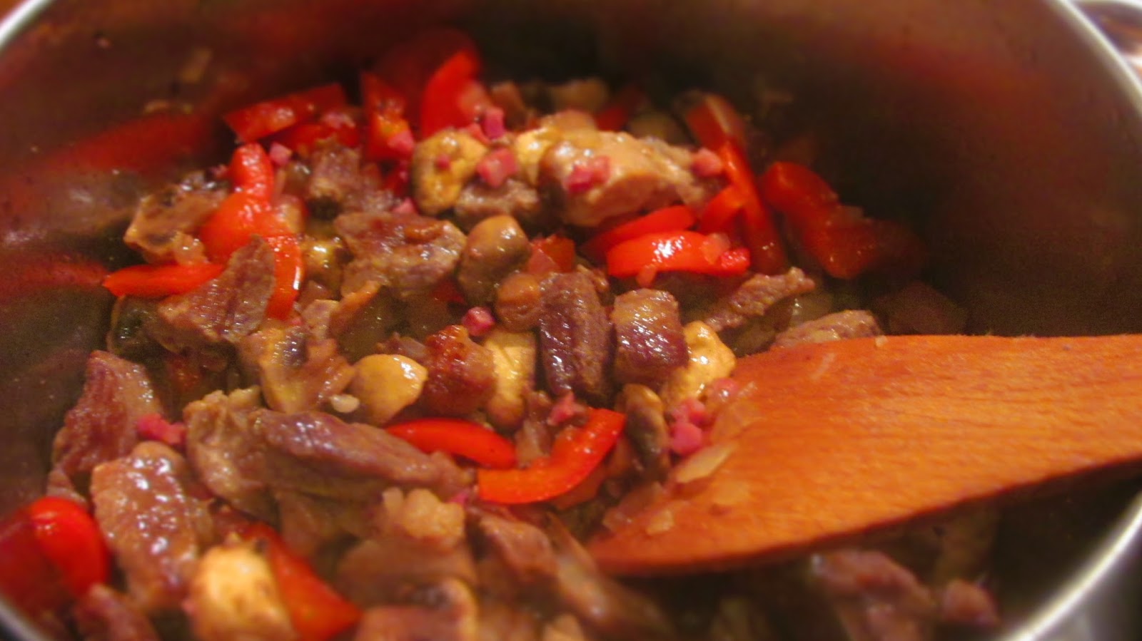 • Когато месото започна отново да се запържва извадих с решетъчна лъжица в купа.
