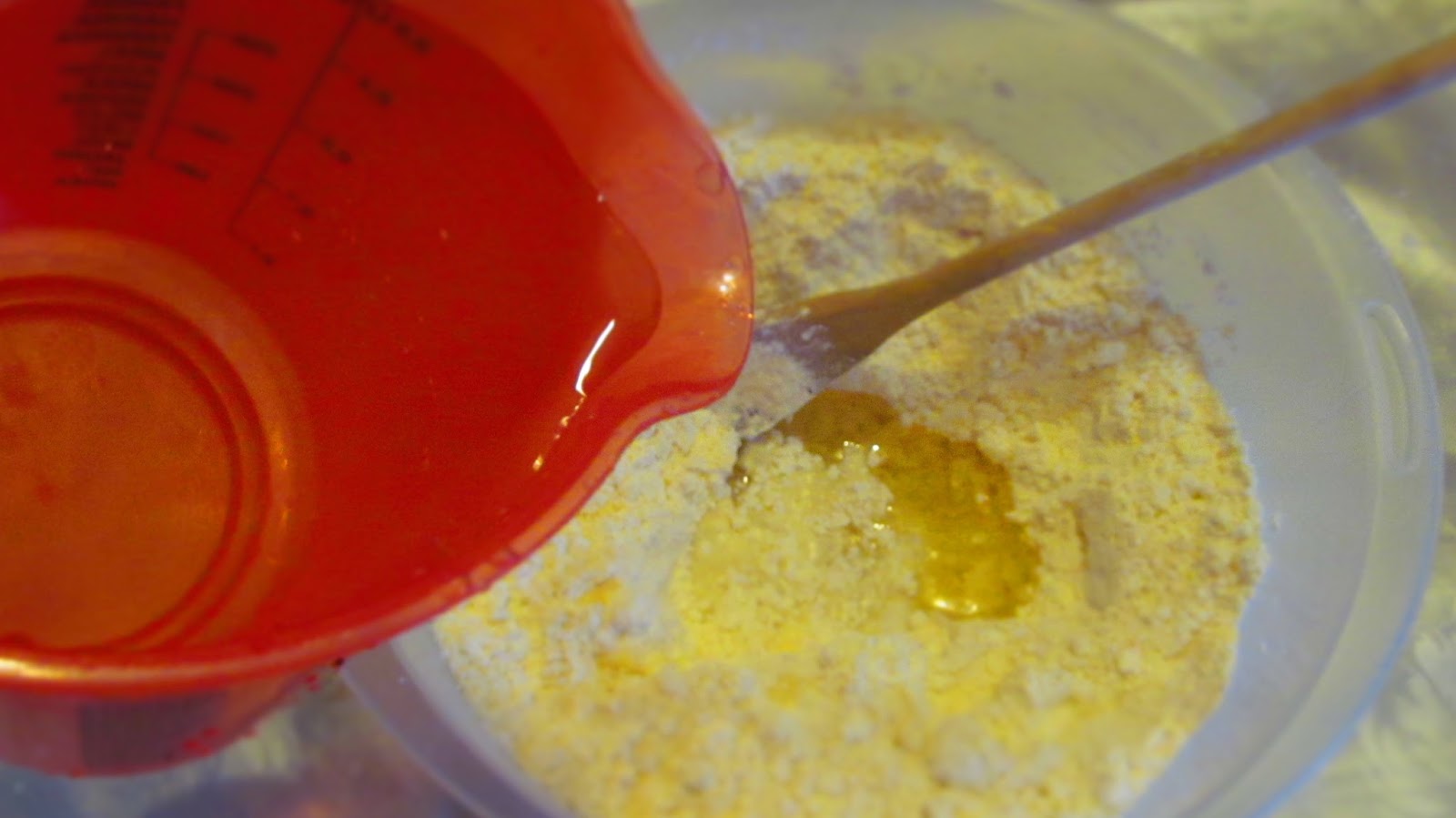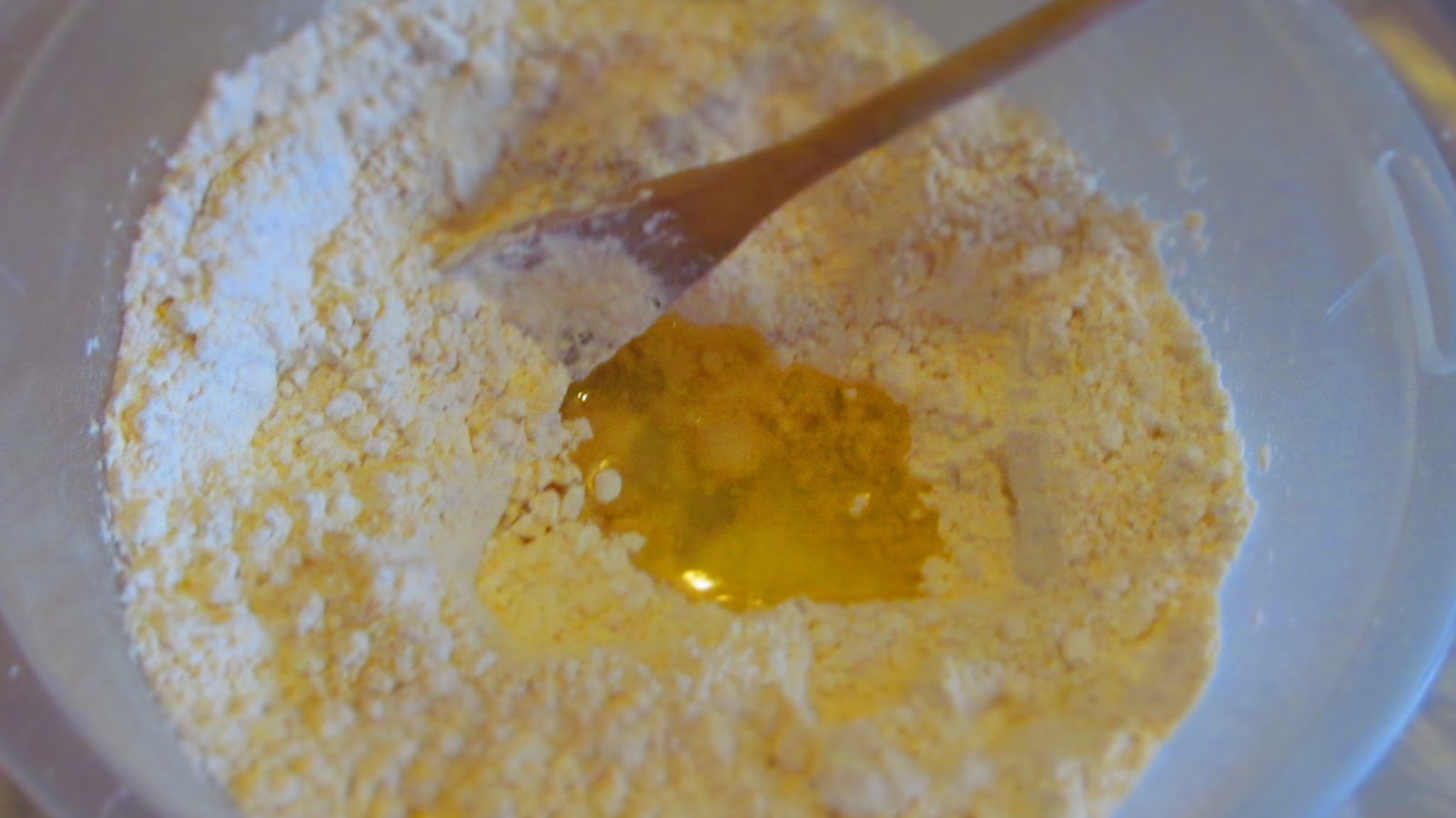 • В купа смесвам всичките брашна, солта и маята. Правя кладенче и изсипвам зехтина.