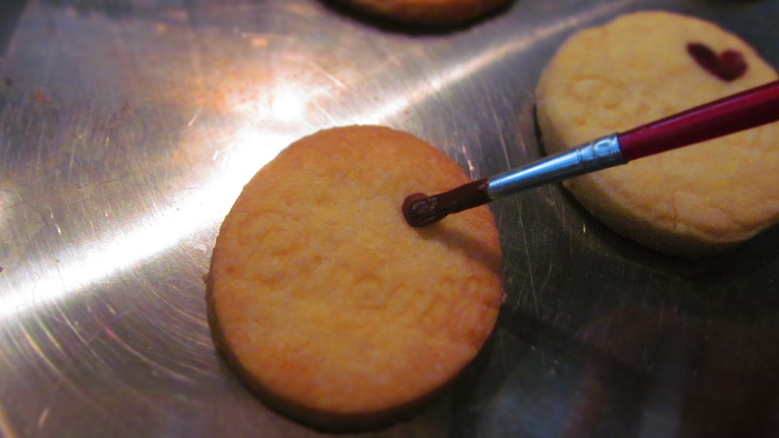 - Оставям да изстинат и с помощта на тънка четка и разтопен шоколад оцветявам сърчицата на моите бисквитки. Красиви стават и със сладкарска боя.