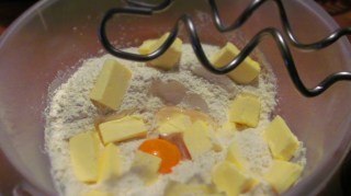 - Начинът на омесване на маслено тесто е вече познат на всички, които следят моите рецепти. В купа смесвам брашното, ванилията и захарта. Правя кладенче и добавям яйцето и нарязаното на кубчета студено масло. Разбърквам с миксер и накрайниците за тесто до получаването на трохи.
