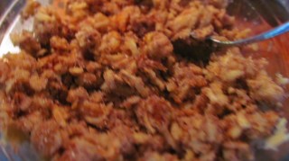 - Ябълките настъргвам на едро ренде и леко ги изстисквам. Поливам с лимоновия сок, за да не потъмняват. Към тях прибавям нарязания на малки парченца марципан /локум/, ореховите ядки, канелата и захарта.