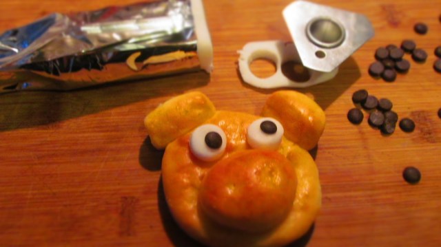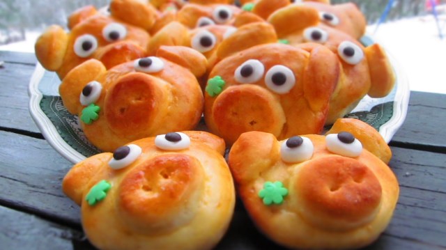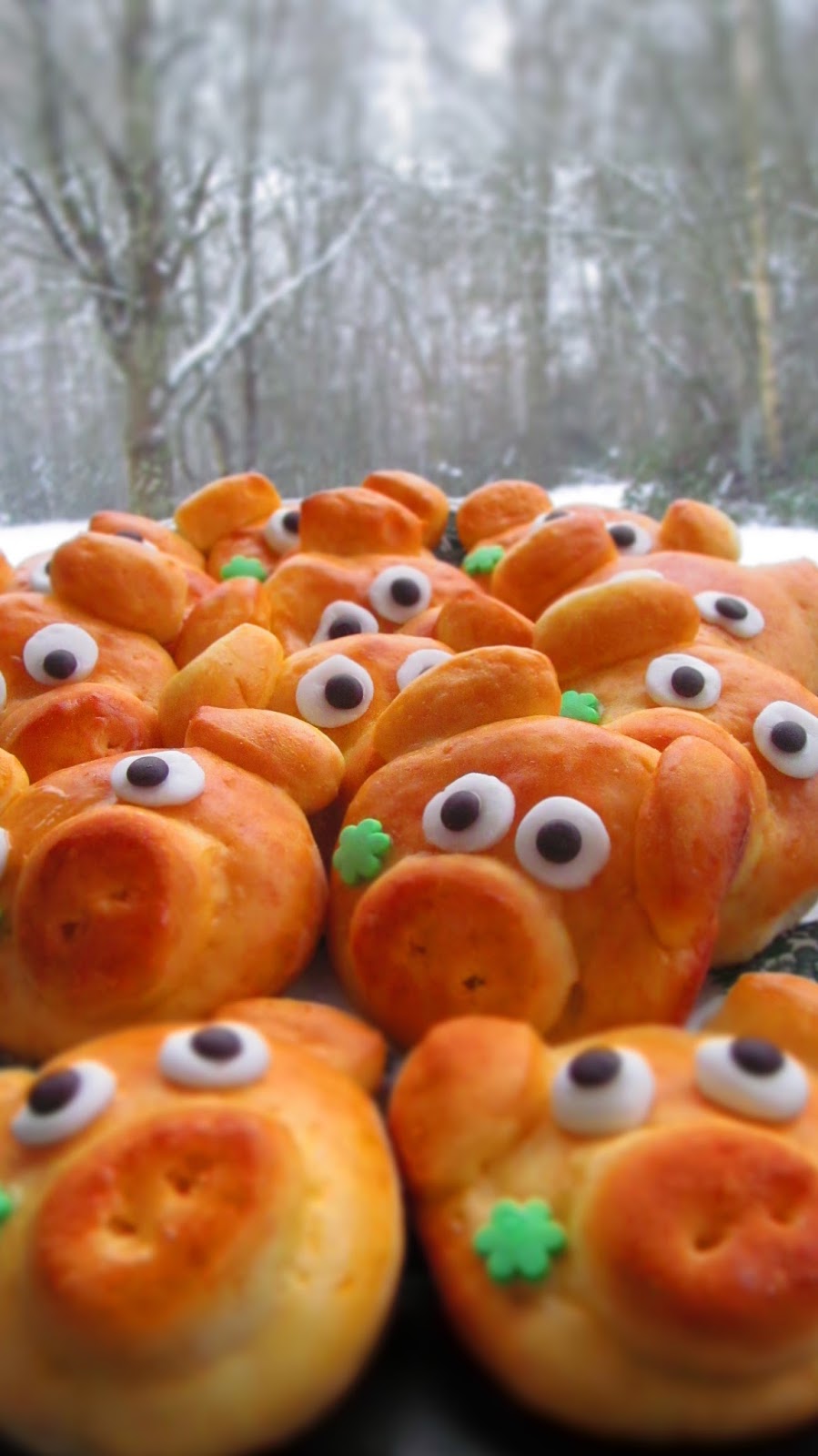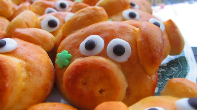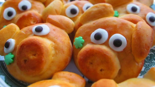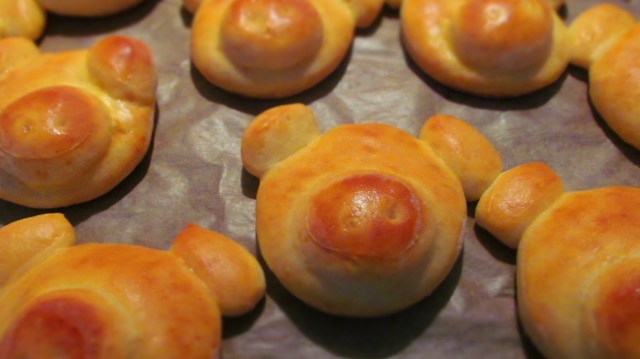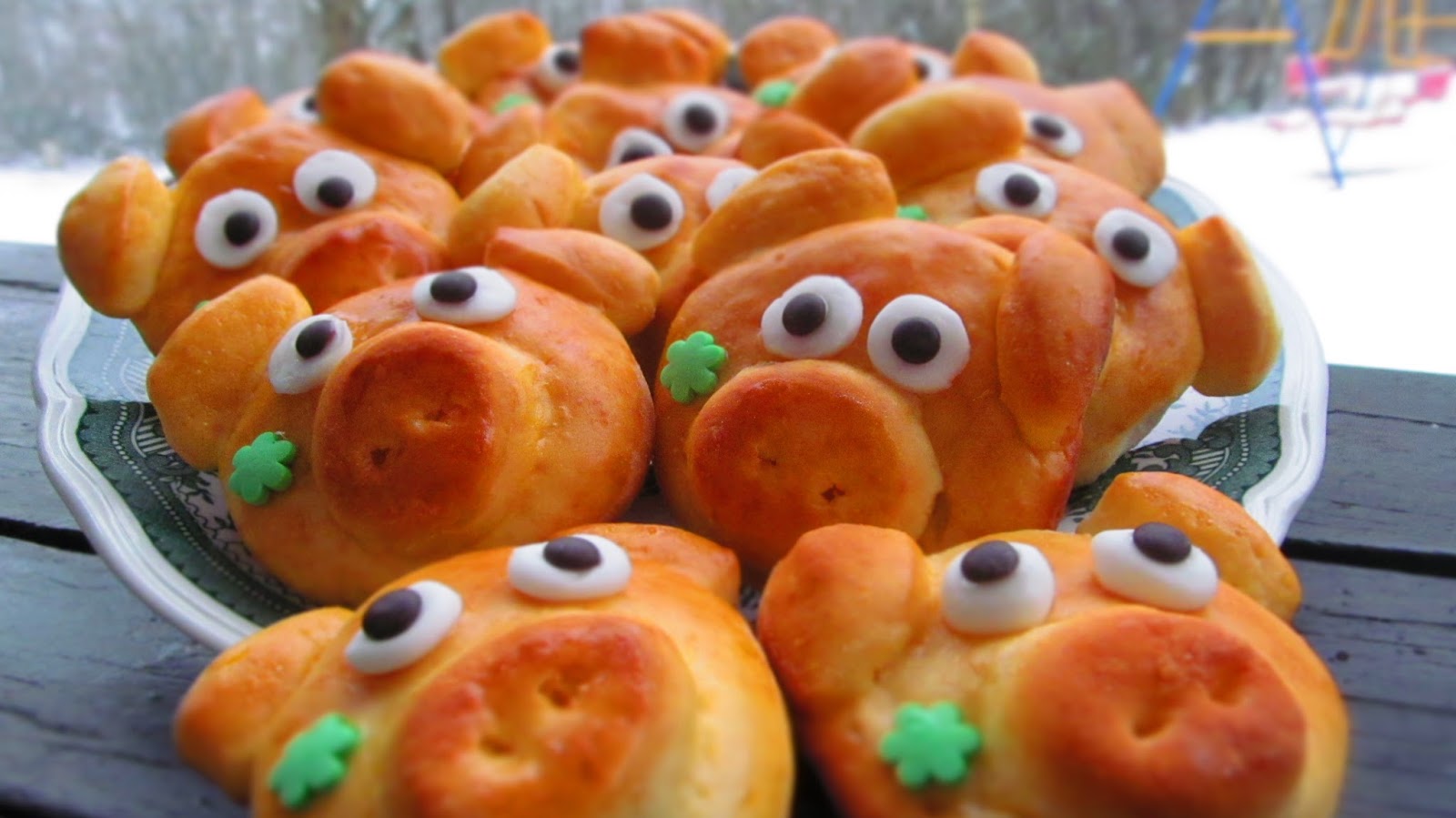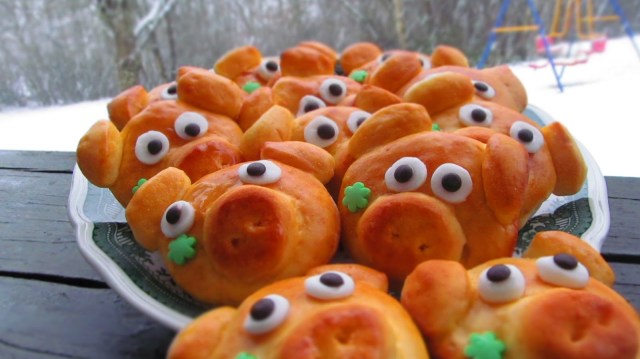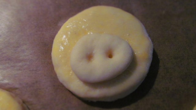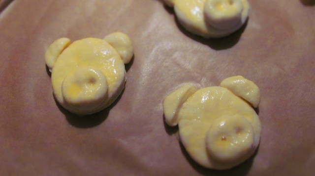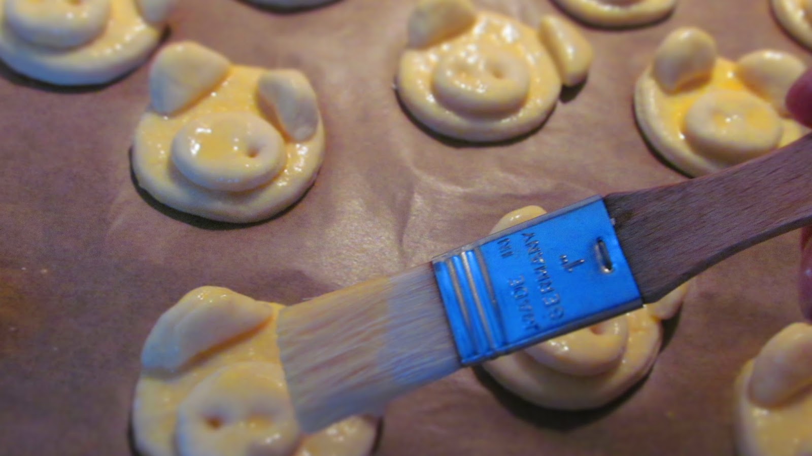 - Жълтъкът разбих с 2 с. л. прясно мляко. Намазах главите на прасенцата с жълтък, за да може да се залепят после нослетата /зурлите/ им.