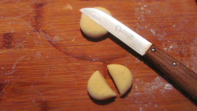 - Останалите 17 малки кръгчета отрязах с помощта на остро ножче на две половини. Това са ушите на прасенцата.