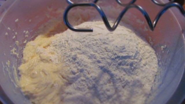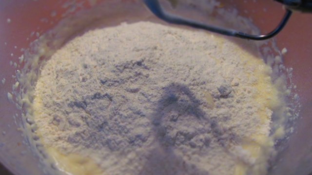 - Добавих половината брашно, размесено предварително с бакпулвера и продължих да разбивам с накрайниците за разбиване.