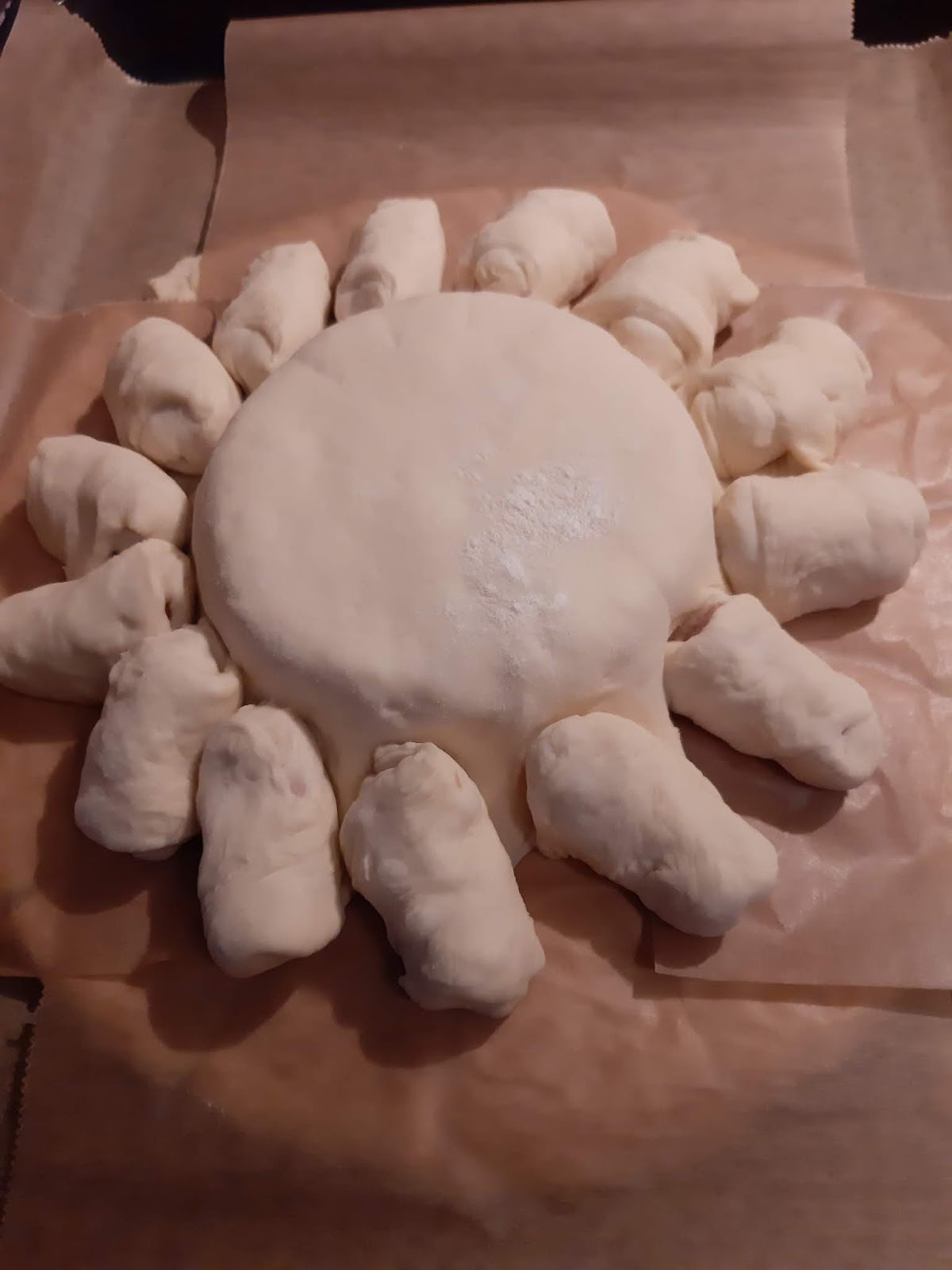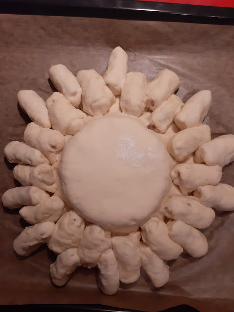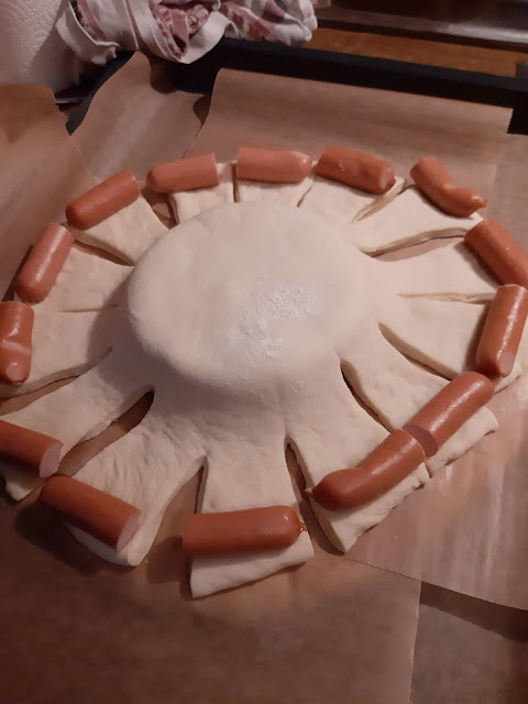 Това е то! Спасението, когато ще правите парти. Приготвяте се лесно и е много ефектно и вкусно.  За тестото използвах известното на Вас всички вече вълшебно тесто. Него приготвих от вечерта и оставих да втаса в хладилник. Намерих и едно подходящо за фондю  сирене или по-голям камембер.  За целта Вие можете да купите всеки сорт, който се предлага на пазара за фондю, за изпичане във фурната или просто камембер. Използвах малки виенски кренвирши, които разполових.