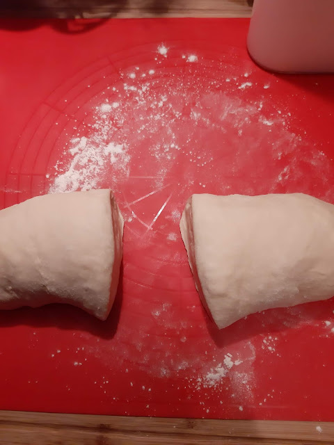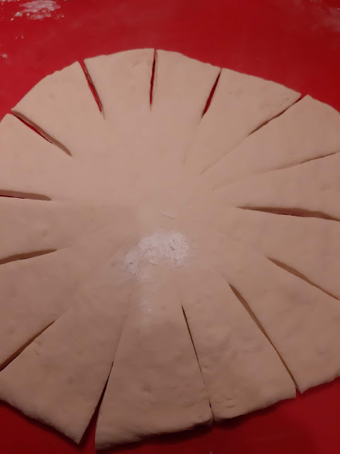 • Втасалото тесто разделих на две и разточих две кори с дебелина около 5 – 7 мм. Този размер е приблизителен.