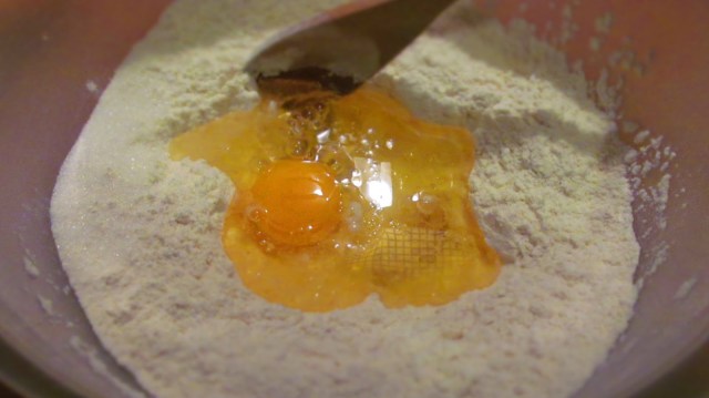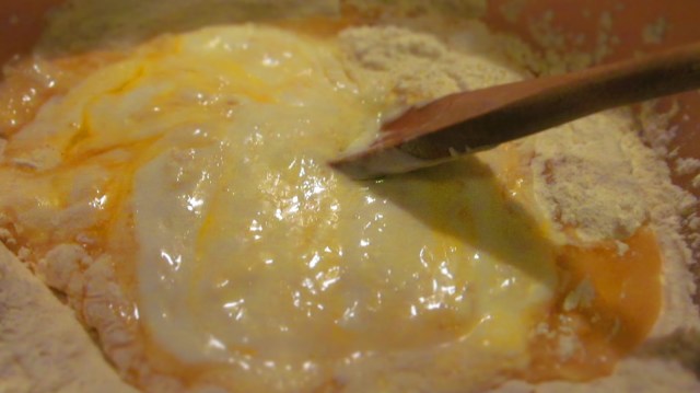 • В кладенчето чукнах едно яйце и белтъка на второто. Жълтъка запазих за намазване на питката. Добавих олиото и киселото мляко.