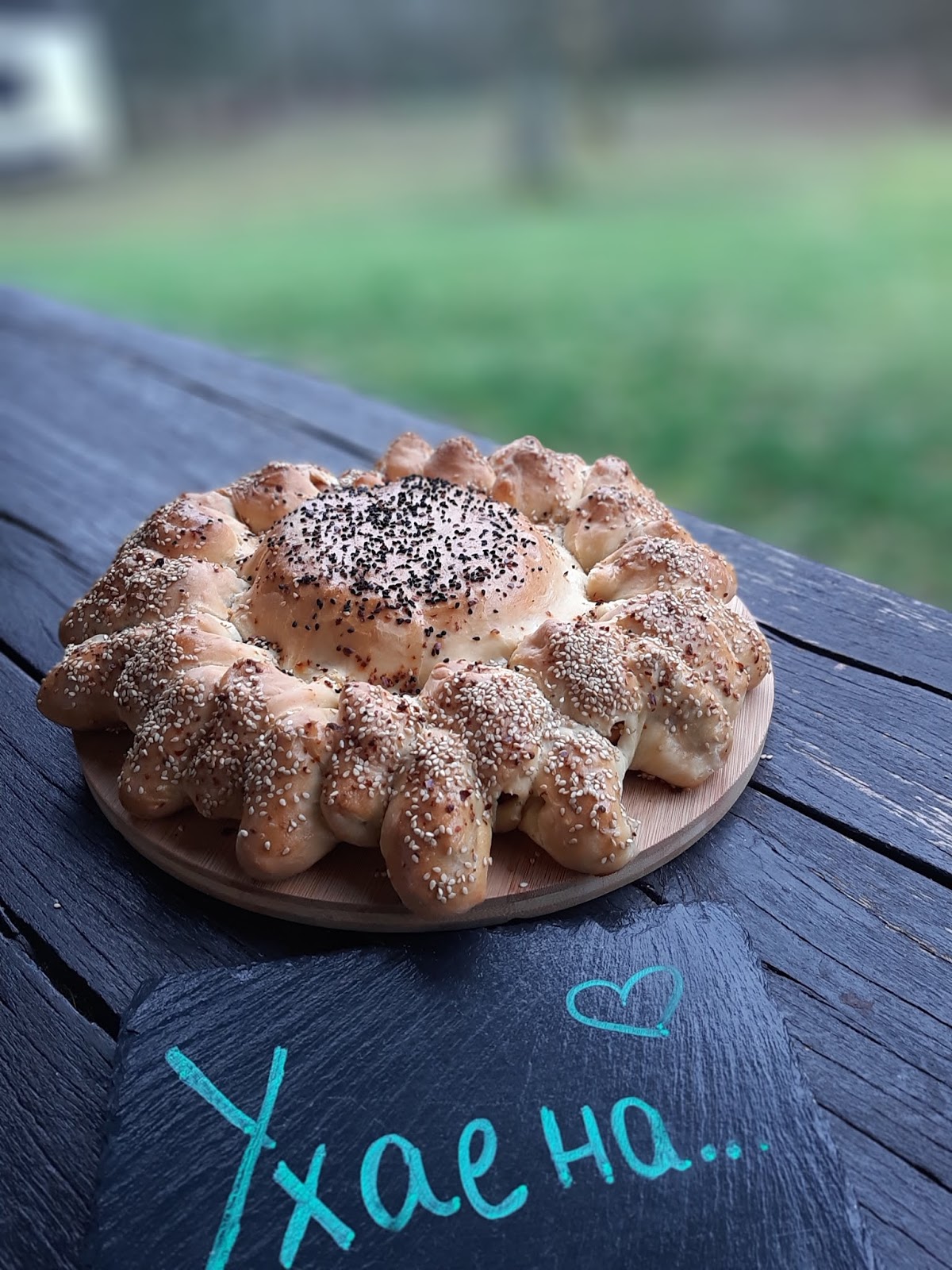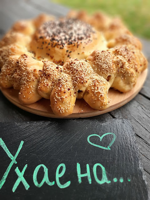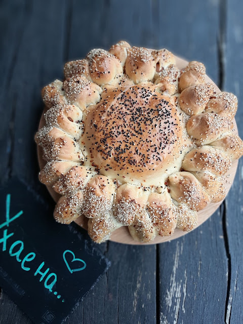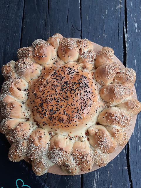 • Намазвам така приготвената питка с разбито яйце и поръсвам външната част с бял сусам, средната част с черен сусам и обилно навсякъде бибер – опушен лют червен пипер.