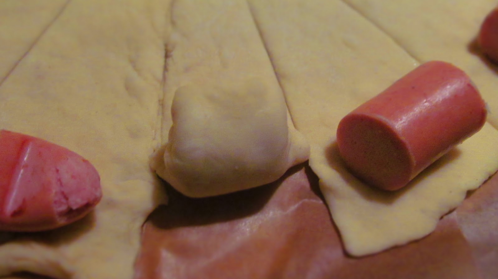 • Всяко кренвиршче първо покрих странично с тесто, а после навих към сиренето.