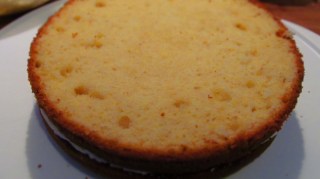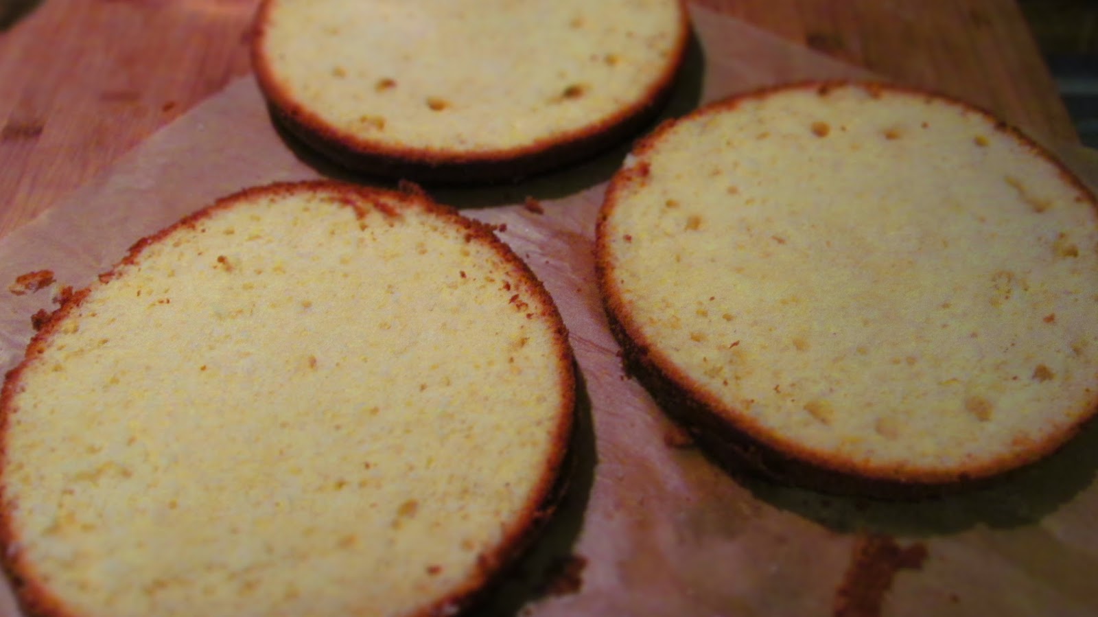 • Разделям блата на три части с помощта на конец. Тъй като тестото е кексово и в средата ми се надигна много при печенето. Точно тази „бабунка“ я изрязах с остър нож и така и трите части станаха с еднаква височина.