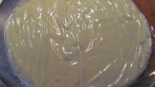 • Горещия пудинг пресипах в купа и покрих веднага със стреч фолио. Така не се получава коричка до пълното му изстиване. Фолиото залепва по повърхността на крема.