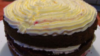 • Слагам втората платка, намазвам с останалото количество конфитюр и шприцвам втората третина от крема.