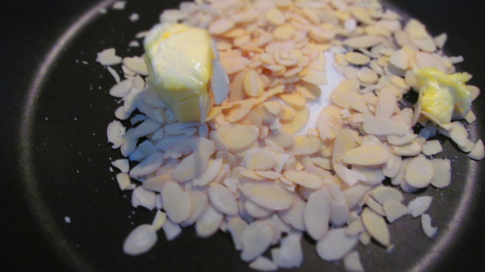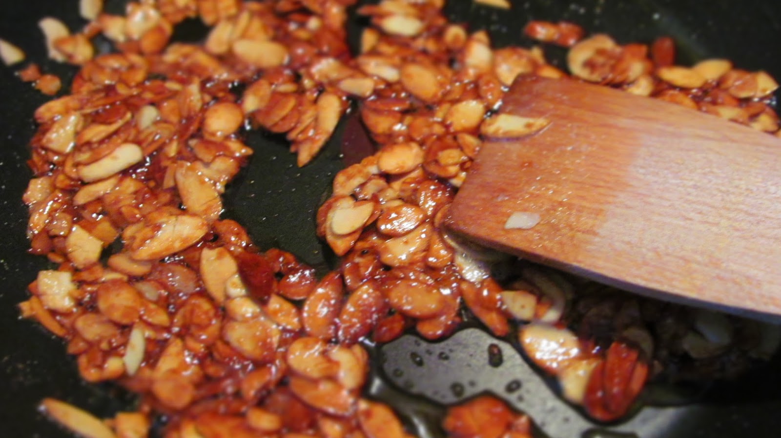 • Когато започнаха бадемите да пушат и получиха тъмно златисто-кафяв цвят махнах тигана от котлона.