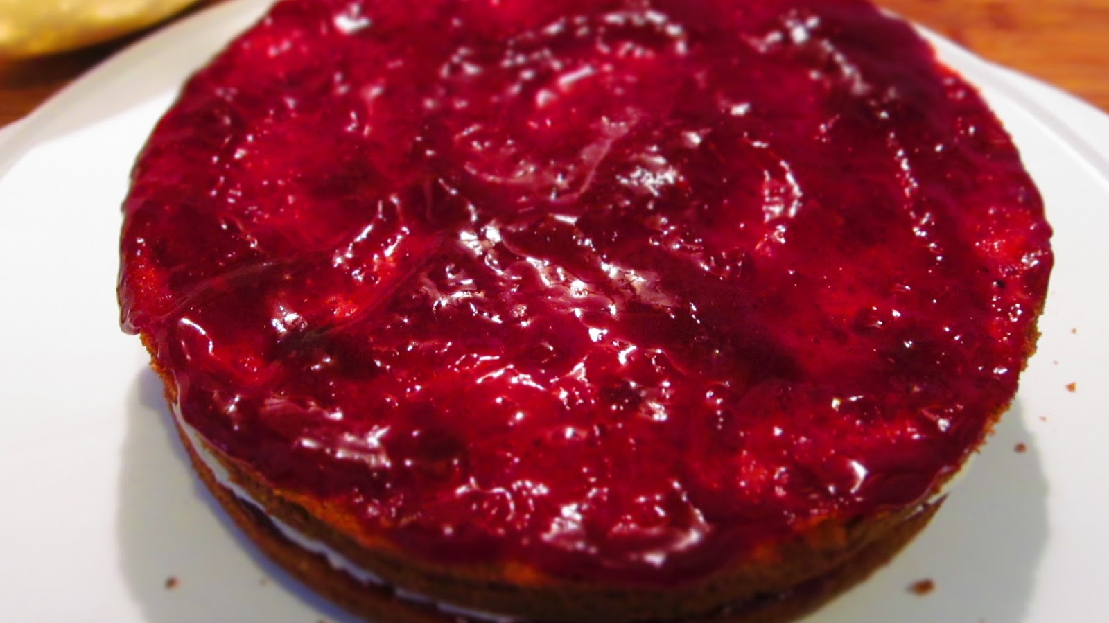 • Първата платка от блата слагам върху табличката за сервиране и намазвам с половината от пасирания конфитюр.