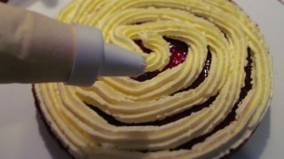 • Върху конфитюра шприцвам плътни кръгове от масления крем. Не пестете крема! Има достатъчно.