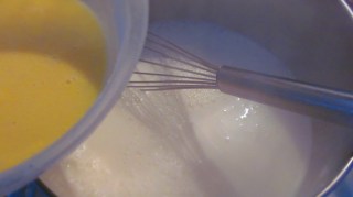 • Започнах с направата на крема като приготвих пудинга, според указанието на опаковката с добавката на захарта и прясното мляко. А именно – разтворих първо пакетчето със захарта и малко от прясното мляко. Останалото прясно мляко сварих и при завирането му добавих разтворената пудингова смес. Бъркането е постоянно на изключен котлон и поне една минута или до сгъстяването на пудинга.