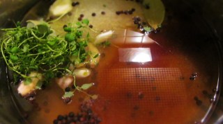 - Щом маринатата завря отделих от котлона и залях със останалите 400 мл студена вода. Оставих тенджерата на хладно, за да се охлади добре маринатата.