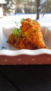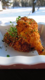 Една вечер – 24 часа, преди сервирането му приготвих маринатата и натопих в нея пилешките бутчета за 12 часа. Сутринта, преди да отида на работа ги прехвърлих да отлежават в мътеницата и вечерта само ги изпържих. Ето това е – правилно разпределено време за приготвяне! В същност самото пържене отне 10 минути и 30 минути във фурната.
