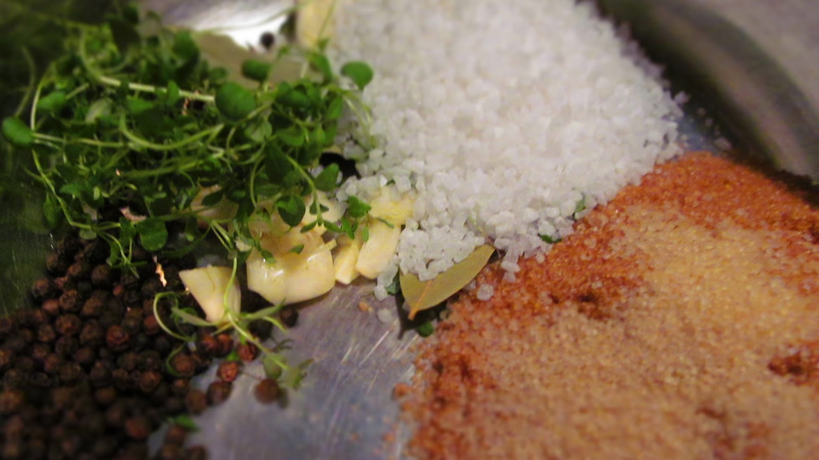 - В тенджерата изсипах солта, захарта, сплесканите скилидки чесън и листата дафинов лист.
