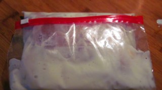 - Изсипах около 400 мл в торбичката при бутчетата. Раздрусах, за да се размесят.